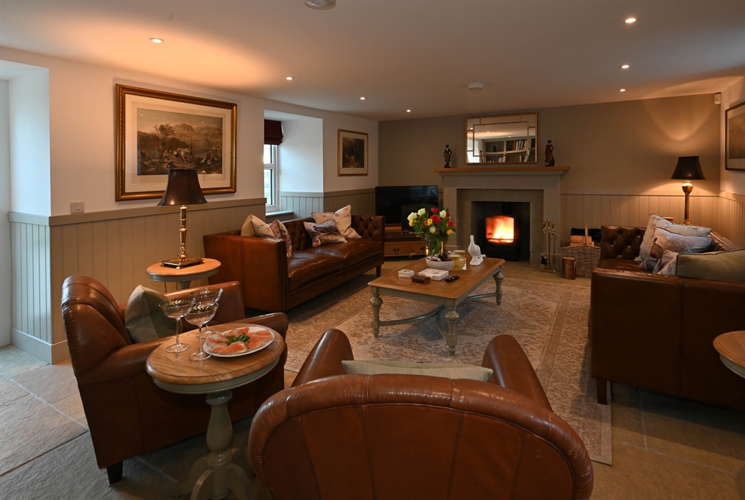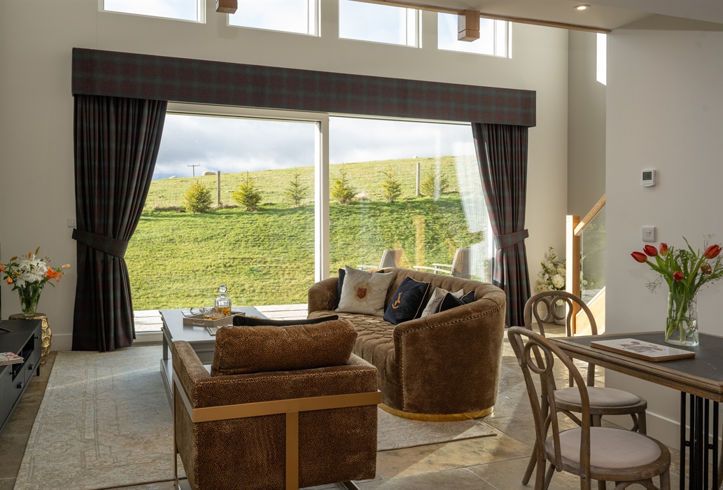 In the farmhouse, a stylish dining area seating 22 makes for easy entertaining. Thanks to its large, double aspect windows and stunning cathedral ceiling, beautiful light floods into the living area and guests can enjoy amazing views across the stunning Perthshire countryside. The drawing room has sumptuous leather sofas and a woodburner for cosy relaxation on cooler days.