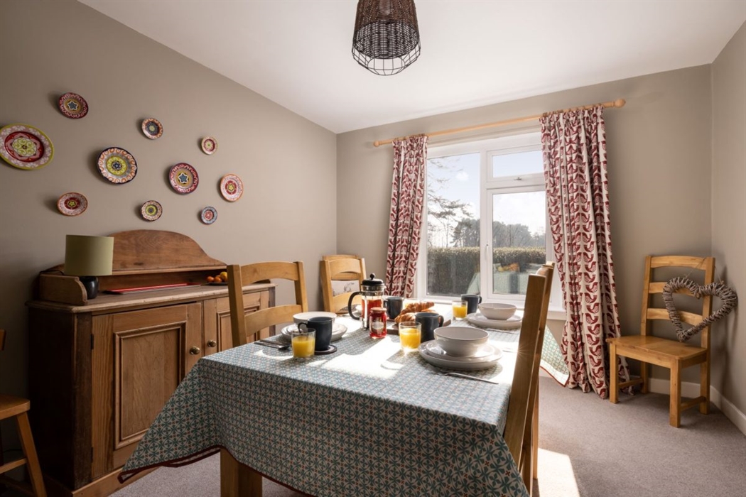Dining room with dining table and seating for 4 – lovely view over the fields to Duffus and beyond.