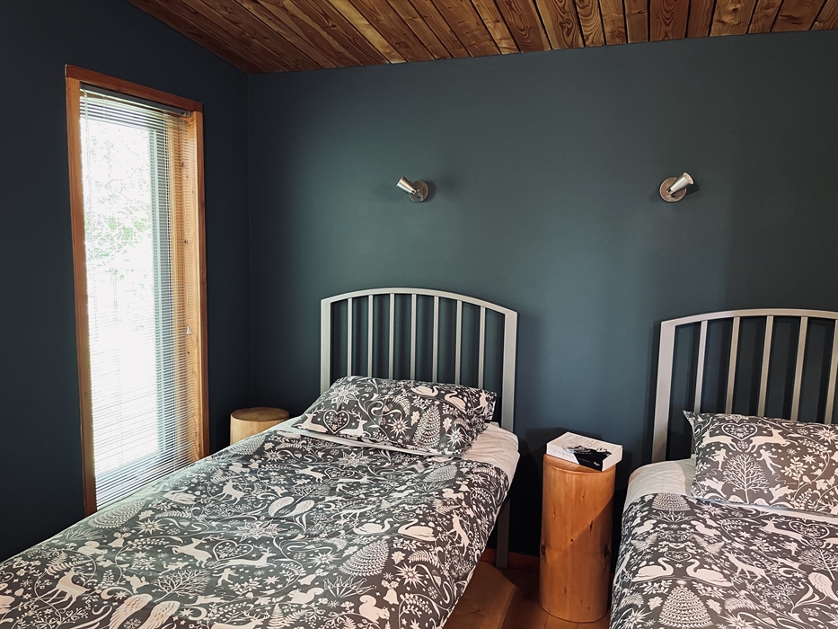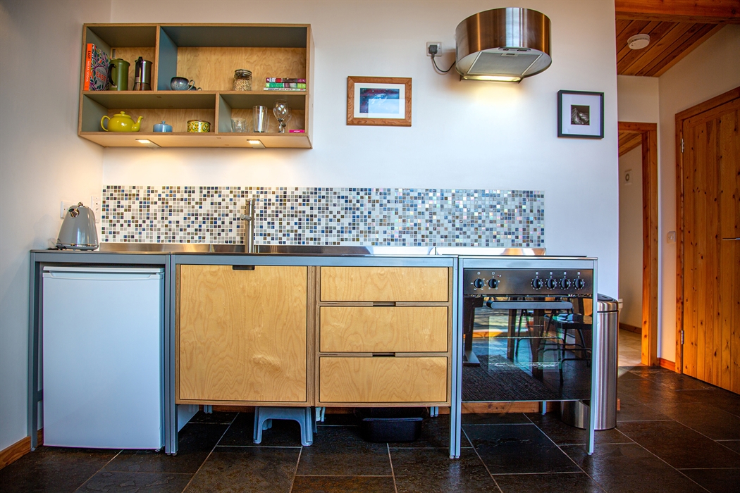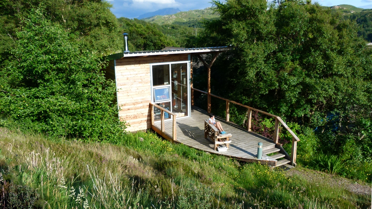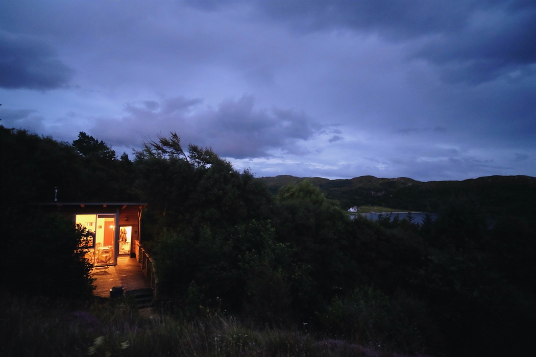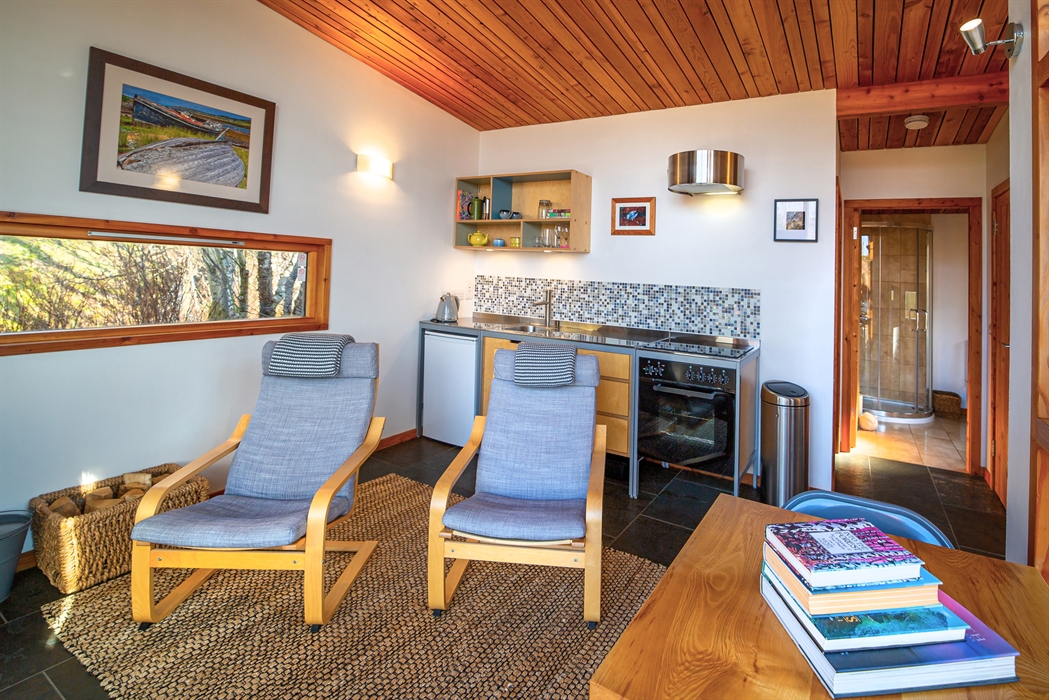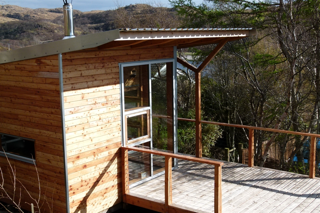 Lazybed is a 31sqm micro-house. It consists of a bedroom that can be prepared either with a king-size double bed or as twin, a lounge, a well equipped kitchen, a travertine tiled bathroom with walk-in shower, toilet and wash hand basin. Sheep’s wool insulates the property throughout whilst hot water is powered by a mini, Norwegian-manufactured, boiler system. The main room has a wood-burning stove keeping the cabin lovely and warm for those occasions when the weather turns inclement. Walk out on to a generous sweeping deck with views South West to Inverkirkaig’s tranquil sea loch and the wonderfully remote peninsular of Rubha na Breige. The high sloping ceiling and 3 metre front windows create a roomy, luxurious, livable space tucked in amongst trees.