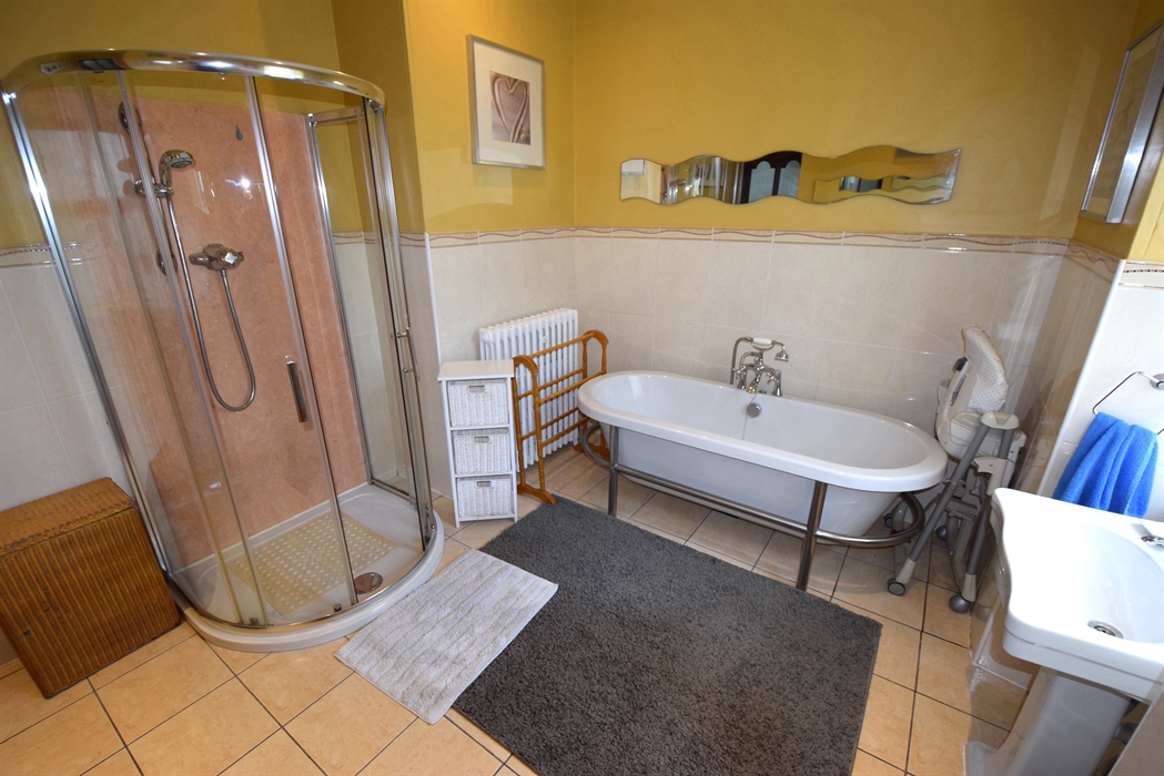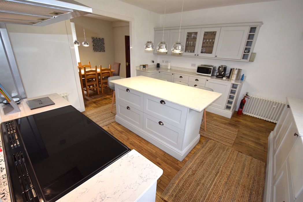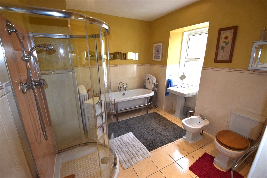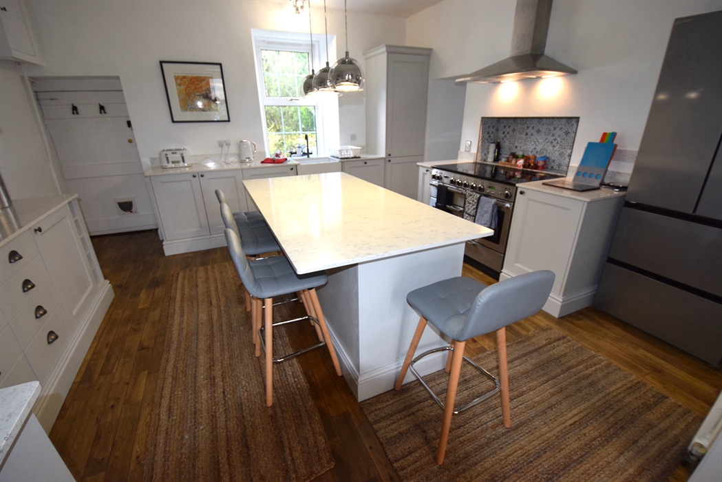 The ground floor has a conservatory entrance. On one side of the hall is a lounge with a TV, fireplace and multi-fuel stove. There is a fully equipped country style kitchen with an island unit seating 4, gas cooking range, fridge/freezer, microwave and dishwasher. Open plan off the kitchen is the dining table – seats 10. On this level is the family bathroom including a bath and a separate shower stall. There is an additional cloakroom with WC as well as a double bedroom.
