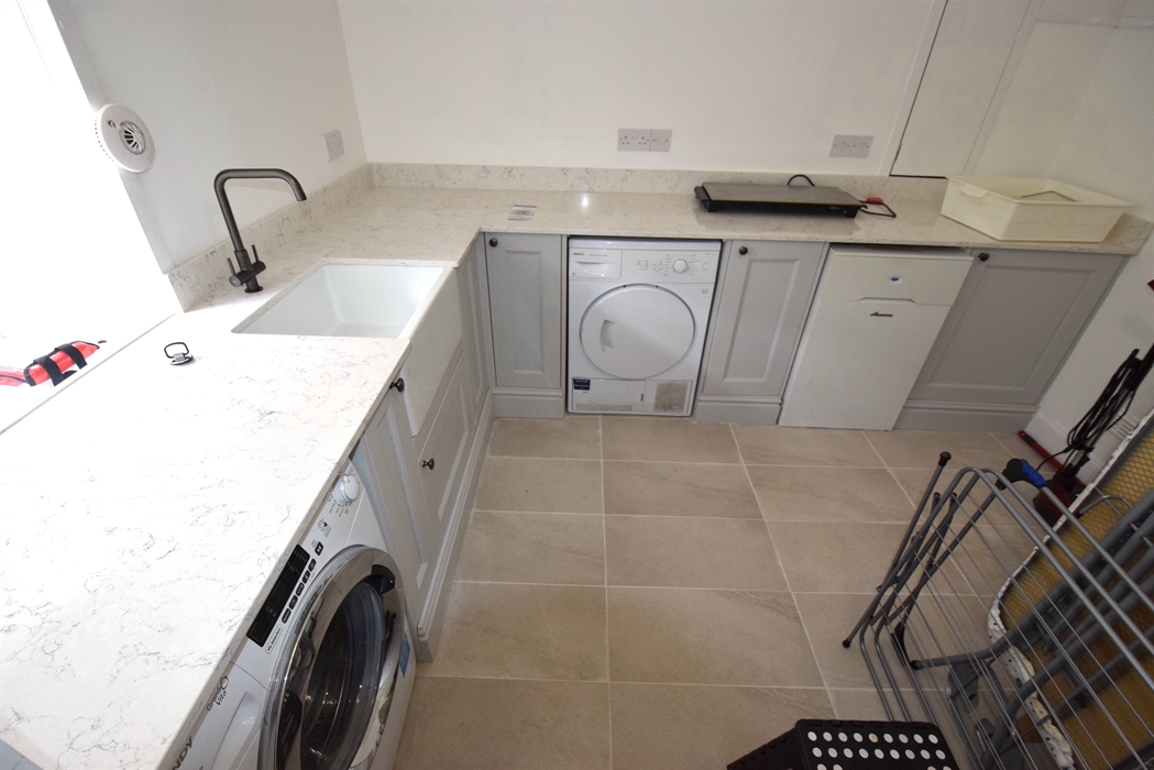 - Utility room with washing machine, tumble dryer, iron and ironing board.