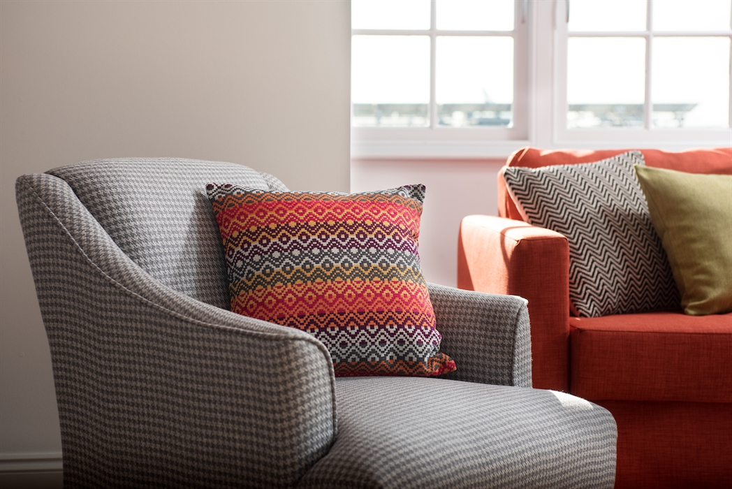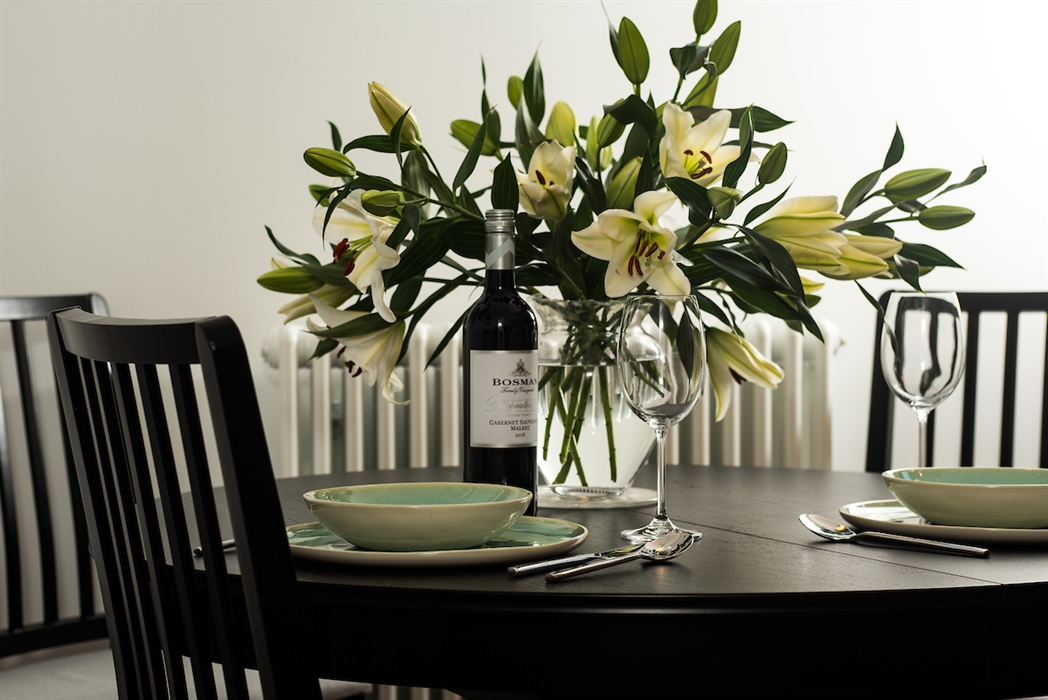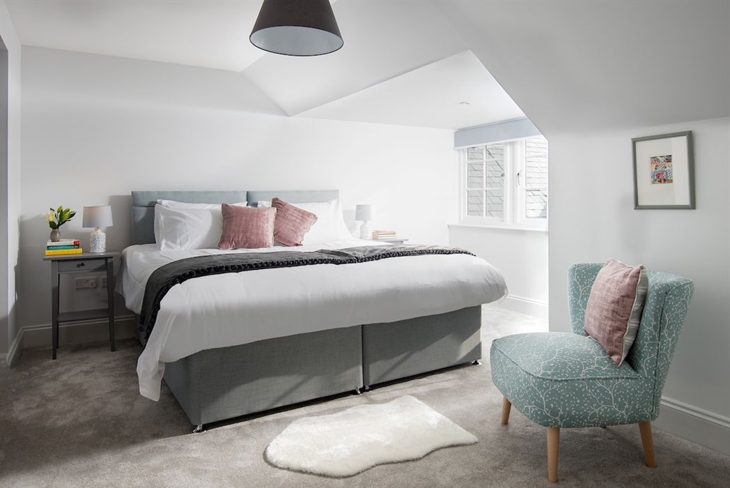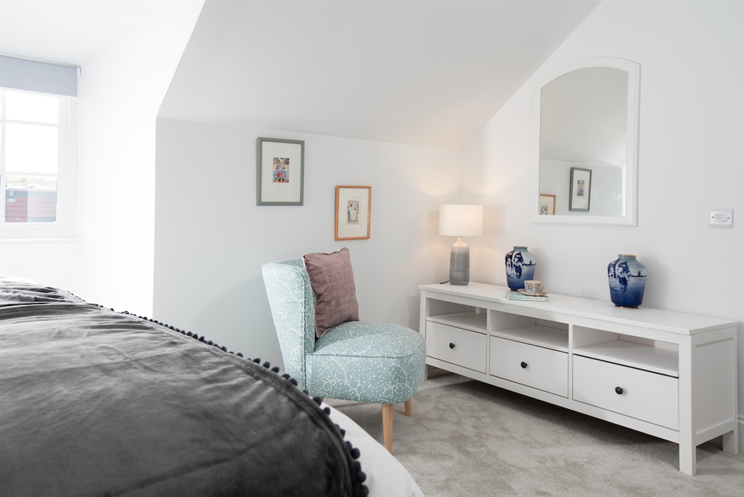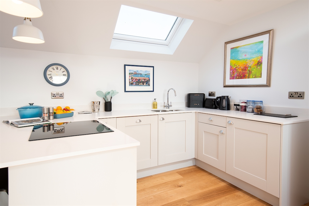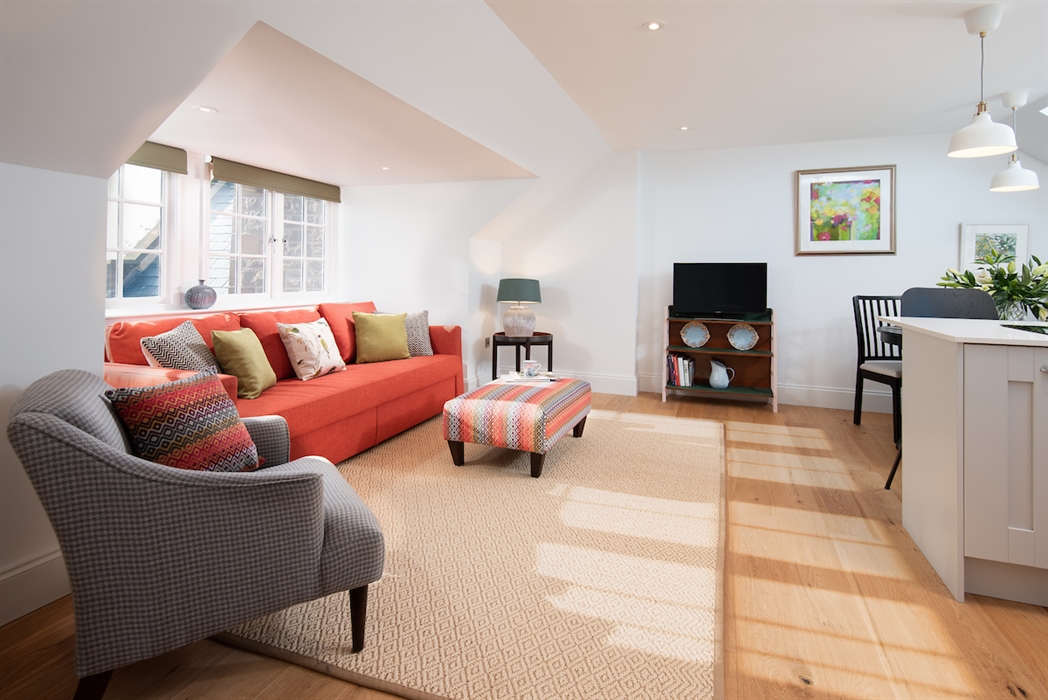The apartment sits on the upper floor with a bright contemporary open plan living space punctuated by lovely pops of colour and views over the rooftops. The kitchen is well equipped with all the main essentials, with a dining space for four and a breakfast bar for those looking for easy holiday catering.