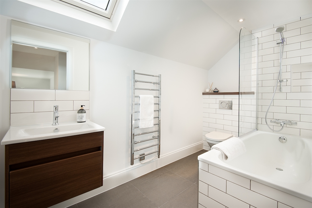 Bathroom with bath and shower over, heated towel rail, basin and WC.