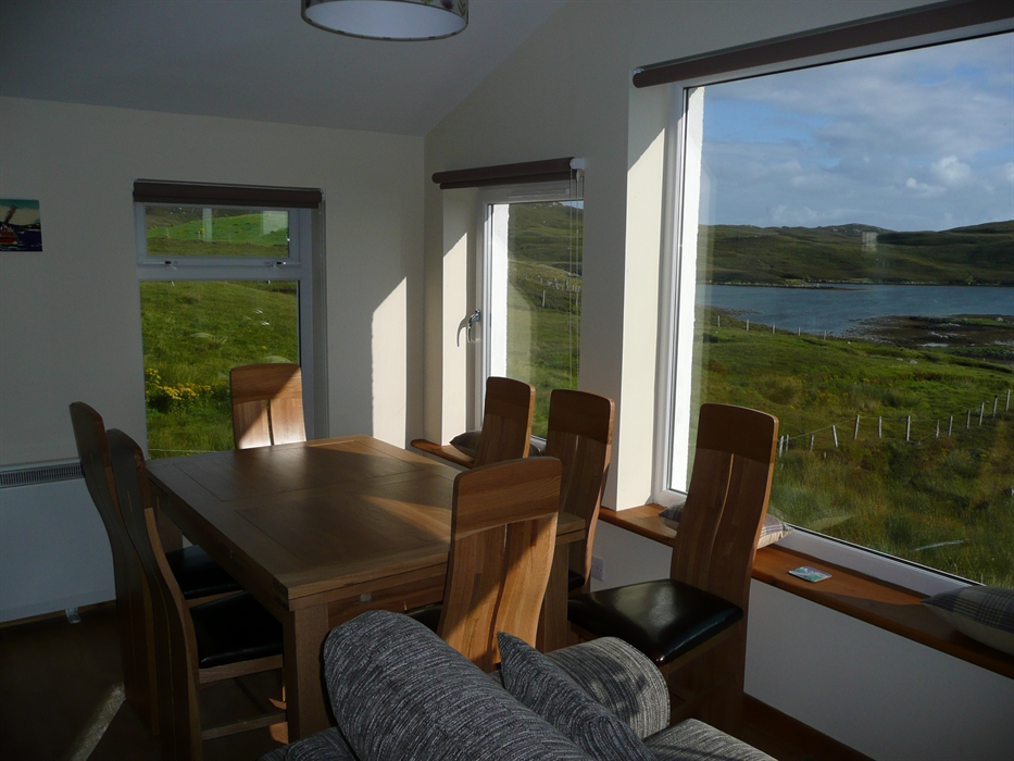 Our lovely Hebridean Holiday Cottage is situated in the small fishing and crofting community of Loch Portain which is a short drive from the delightful village of Lochmaddy on the island of North Uist. This holiday cottage is decorated and equipped to a very high standard including a large new extension. Loch Portain House sleeps up to 8 guests - one kingsize bedroom with en suite shower, two twin bedrooms & a good quality bed settee in the lounge. It also has a large family bathroom. Relax sitting beside the open peat fire and enjoy the views over Loch Portain from the spacious sitting room & dining area which also features a fully fitted kitchen with island bar. There is a flat screen TV with Freeview, DVD player, iPod dock, microwave, washer/drier, fridge/freezer and dishwasher.
