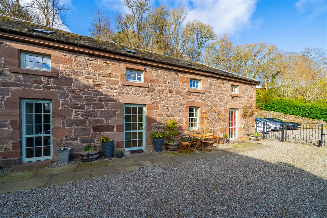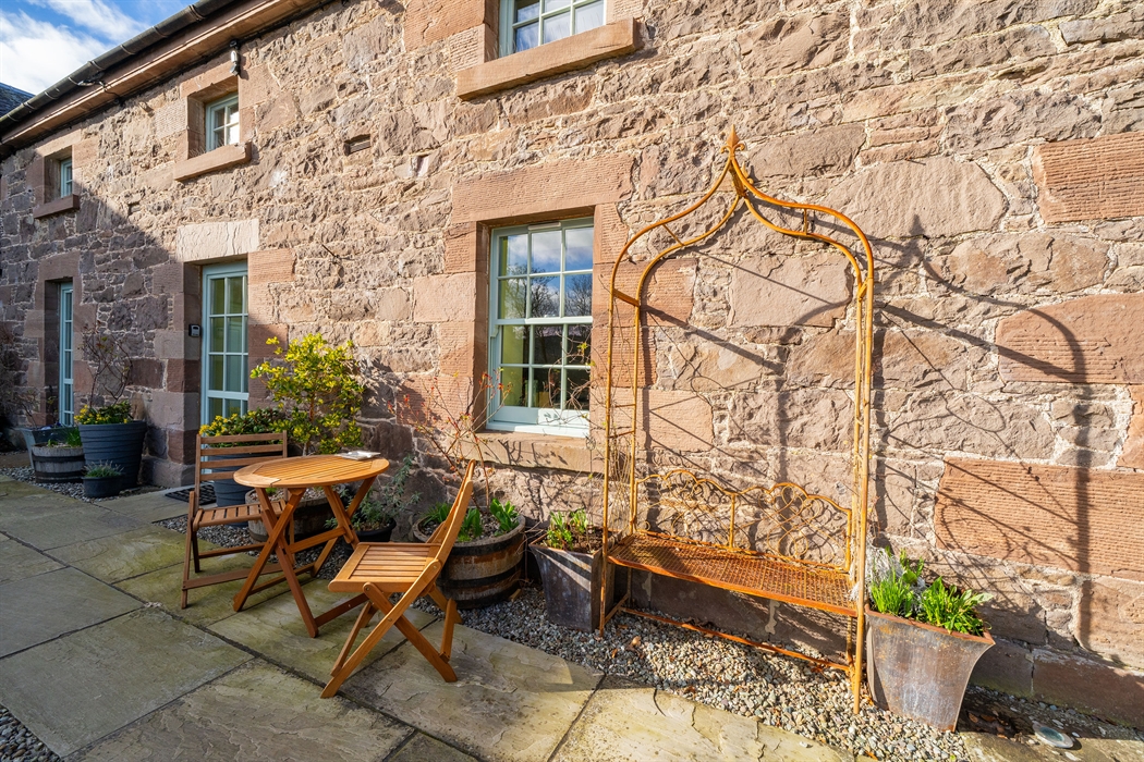 Outside: Gravel Courtyard to front with seating, note shared access to owners house.Guests are welcome to share the owners garden which is up a flight of steps to rear of cottage.