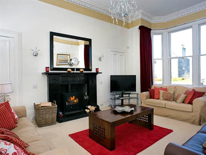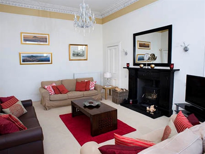Right of the hallway awaits a warm, Victorian period sitting room with fire and large bay window offering Firth of Forth sea views - Beautifully furnished & has three settees & large TV. A stunning crystal chandelier hangs from the original ceiling rose.