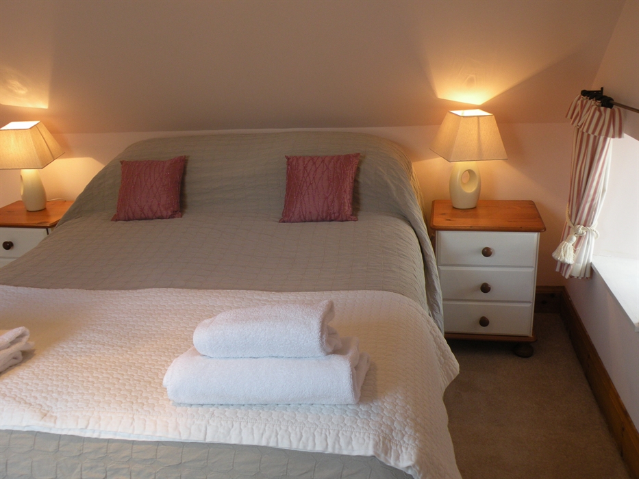 Sleeps 4 with two bedrooms; one double bedroom (first floor) and one twin bedded room (ground floor), a sitting room with open fire, and television.