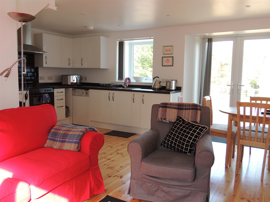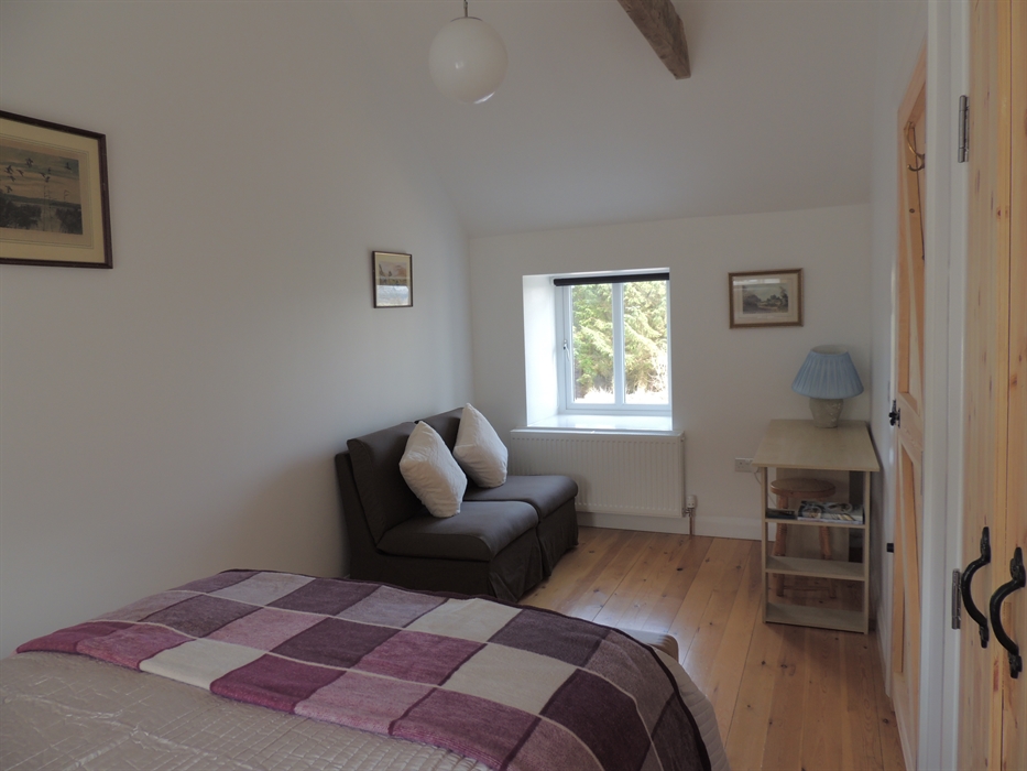 Upstairs there’s a generous double bedroom with built-in wardrobes and comfy chairs from which to bird-/red squirrel-watch and a twin bedroom designed with star-gazers in mind. The lovely bright bathroom provides a shower-over-bath, vanity unit with shaver socket, oodles of hot water and WC. All linen and towels are supplied free of charge.