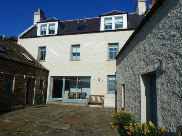 Individually styled with relaxed Orkney character the house is Ideal for the larger group or family with generously sized rooms and all have magnificent views over Scapa Flow. The house is fitted with high spec bathrooms with two en-suite on the first floor one with a luxury cast iron roll top bath and a family bathroom on the second floor serves the two upper bedrooms - one of these has an en-suite WC. The large kitchen diner is very well equipped for proficient cooks and seats 8 comfortably. You will find a generous welcome pack of local bakery and breakfast provisions ideal for a late arrival and the cooks larder kept stocked with olive oil, condiments, herbs and spices, rice, flour, sugar. Tea and coffee are also provided. Local shops are a short walk away with a delicatessen, excellent butcher, bakery and the local supermarket is open daily. Fish, crab and lobster can be purchased directly from local processors for unforgettable eat-in dining. There are also take-aways available nearby if you wish to eat in and prefer not to cook. Taste local dishes from the menus at local restaurants, pubs and cafes. A drying area at the back entrance keeps wet weather gear away from the living areas. If weather keeps you indoors, the Bose i-pod dock and BT Vision will entertain you or browse the many magazines and books, Orkney information folders to plan your next trip out to or begin a craft! The shared courtyard and pier garden is great for eating outdoors or just sit and admire the outstanding view of Stromness Waterfront with its unique stone built piers and watch the sea wild life, boats and ferries passing by. All outdoor activities are with easy distance, the golf club, loch and sea fishing, cliff top walks, cycle hire, birdwatching from wetland hides , seal watching from rock pooled beaches, or take a ferry to Hoy from the harbour for a day to remember and walk to the Old Man. Try any or all of these and you are certain of a memorable holiday.