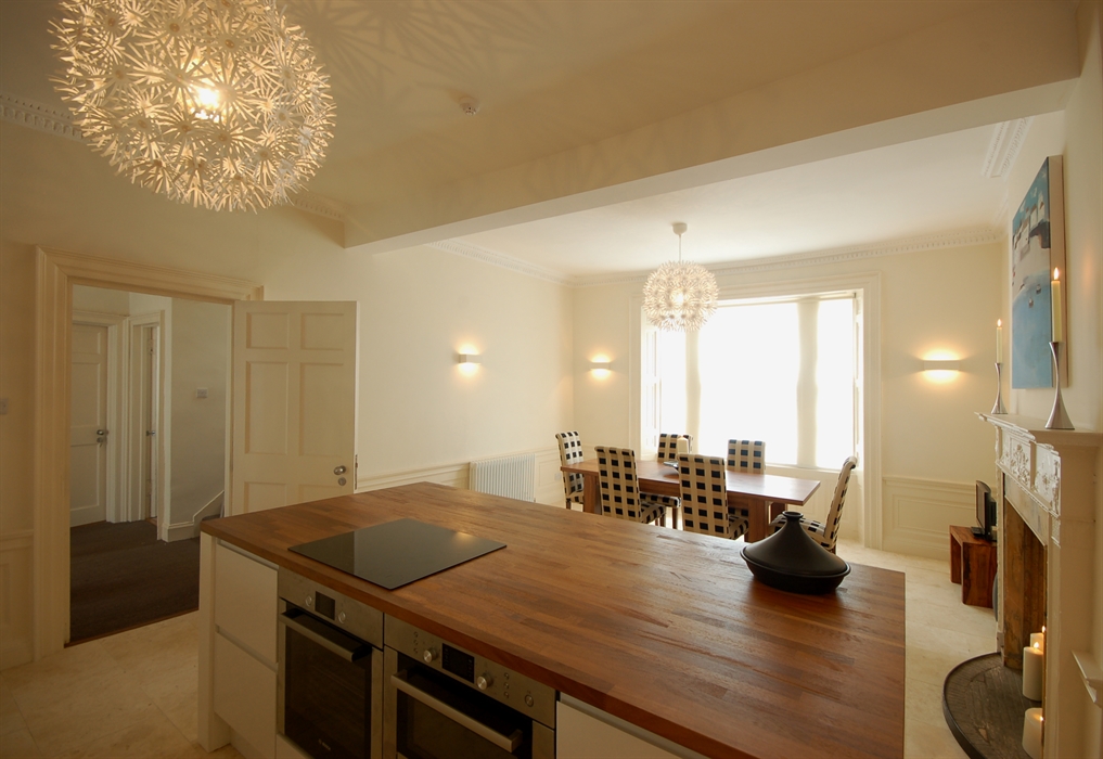 Set on the first floor the large kitchen is fully equipped and contains integrated appliances including dishwasher, microwave and coffee machine. The room finished with limestone floors and solid Iroko timber work surfaces has an island unit breakfast bar and open plan dining space sitting eight guests (a high chair is provided) and is therefore the perfect setting for relaxed dining and lasting holiday memories.