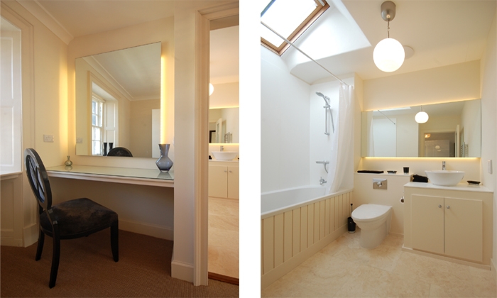 There are two master suites located on the second floor, each containing super king size beds, dedicated dressing areas and ensuite bathrooms with limestone floors and underfloor heating. A single room is located on first floor and a spacious double bedroom with king-size bed is located on the ground floor entrance level. All bedrooms are fitted with privacy roller blinds, black out blinds or curtains and spare blankets and throws should you need them.