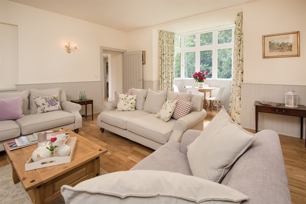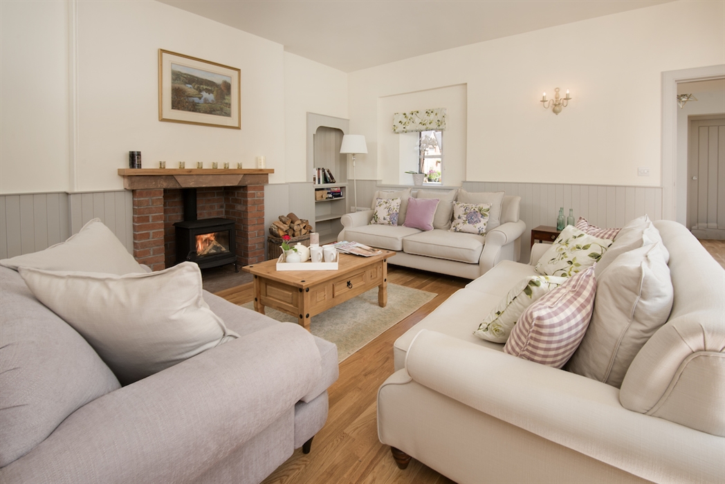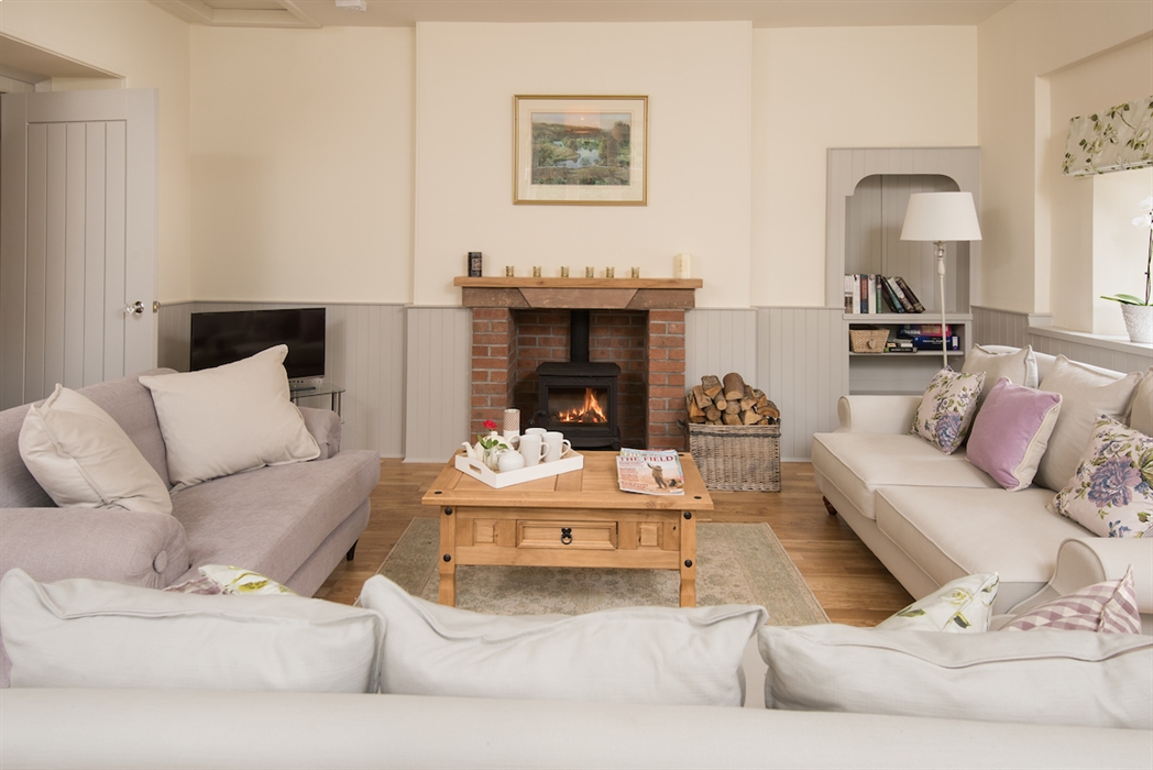 Sitting room with spacious sitting room with two large double sofas, generous armchair, wood burning stove with logs supplied. Technology includes a flat screen TV and Blu-ray DVD player. Selection of books and games.