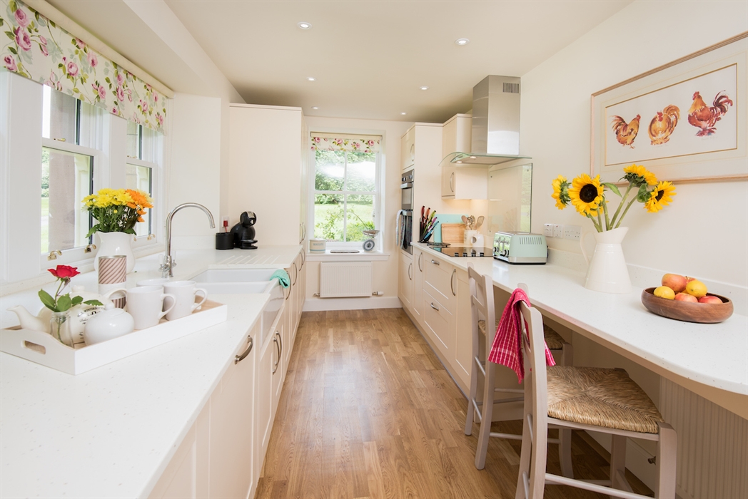 High quality kitchen with granite work surfaces. Breakfast bar area with two bar stools. Electric oven and grill, ceramic hob, large integrated fridge/freezer, integrated dishwasher, microwave, Dolce Gusto Nespresso coffee maker.