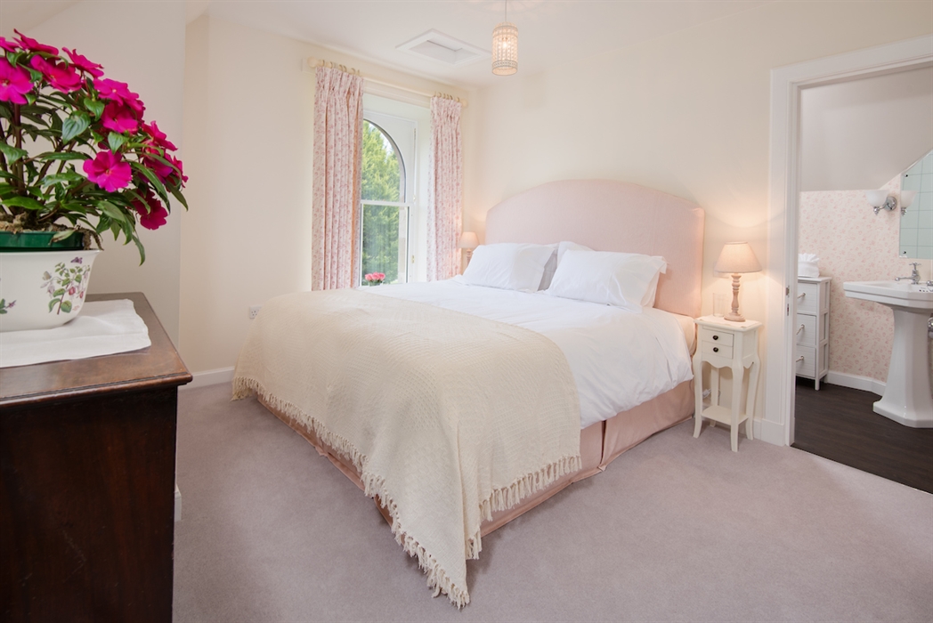 Bedroom four with 6’ super king bed, side tables, dressing table, large cupboard with shelves and hanging space. Garden views.