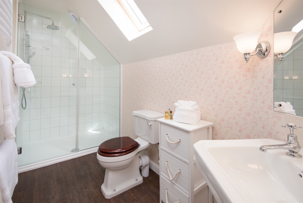 En-suite with large shower unit with rainforest head, heated towel rail, basin and WC.