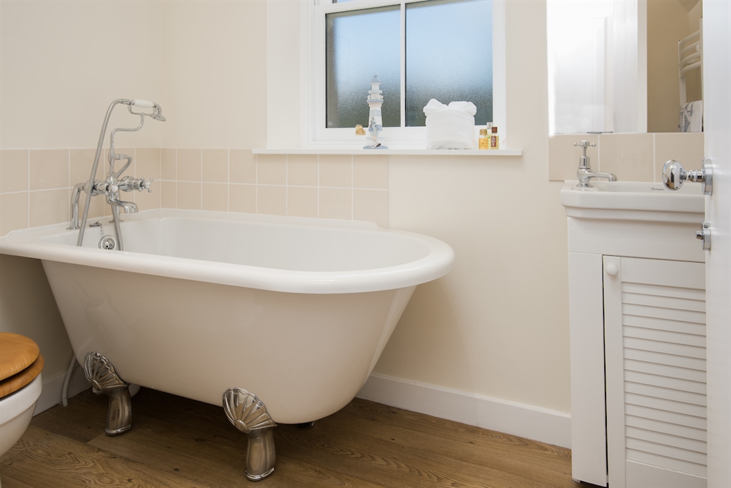 Family bathroom with roll top bath and handheld shower, heated towel rail, basin and WC.