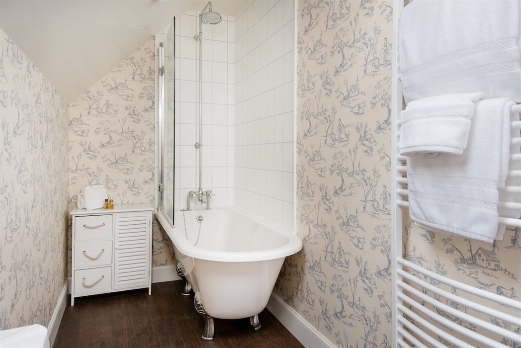 En-suite with roll top bath and shower over with rainforest head, heated towel rail, basin and WC.