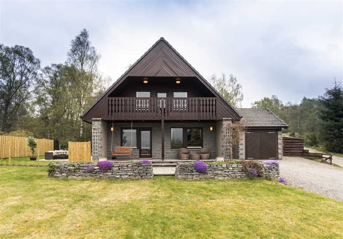 This Alpine-style lodge, featuring four bedrooms and a hot tub, comfortably accommodates nine guests, offering a beautiful retreat with a fabulous view.