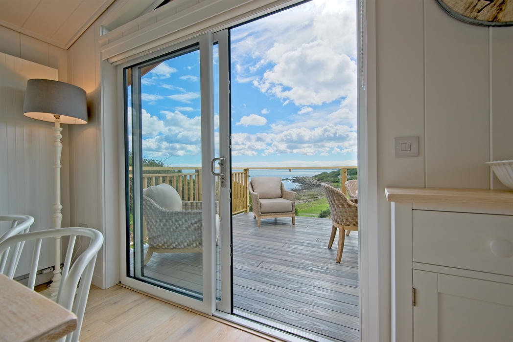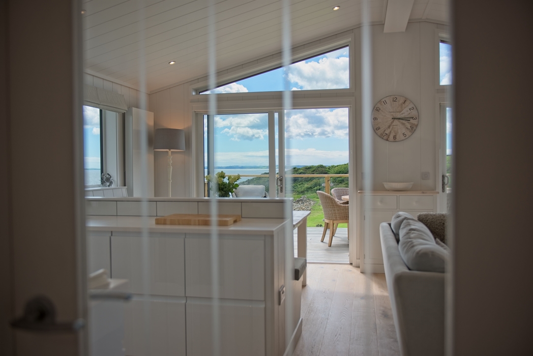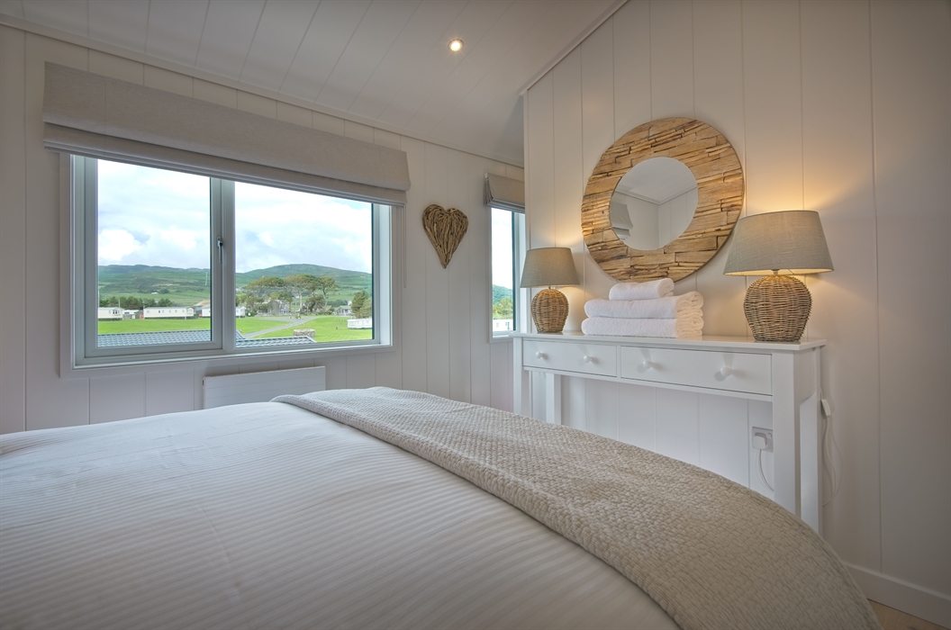 The lodge has a wonderfully spacious open plan kitchen/dining/living area with doors that open on to an enclosed deck with stunning views across Mossyard Beach to Wigtown Bay, with the evening sunsets and views to Ben John and the Galloway Hills from the Living area and Master Bedroom. Set on the headland, in a group of 5, these lodges are ideal if you wish to be accommodated together as a group.