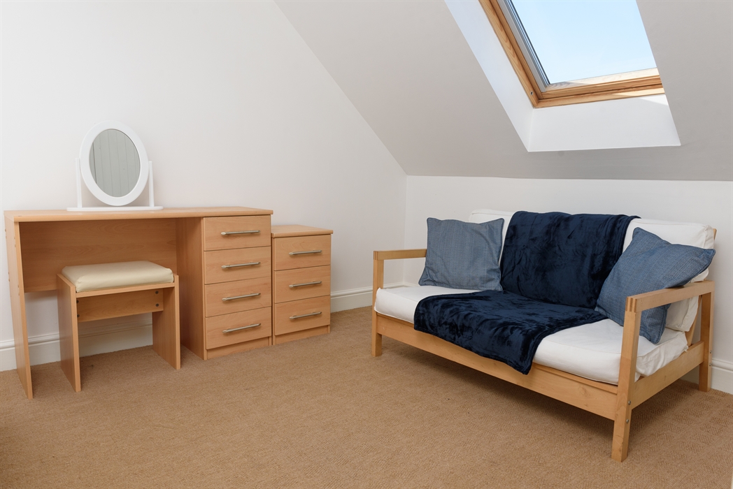 Ground Floor: Entrance door to Kitchen; Sitting room/Dining room with smart tv and smart speaker, steep stairway to first floor; Bathroom with over bath shower, WC and sink.