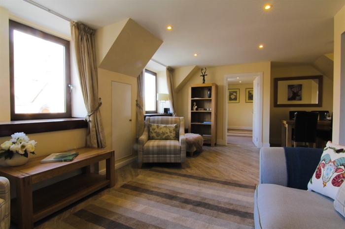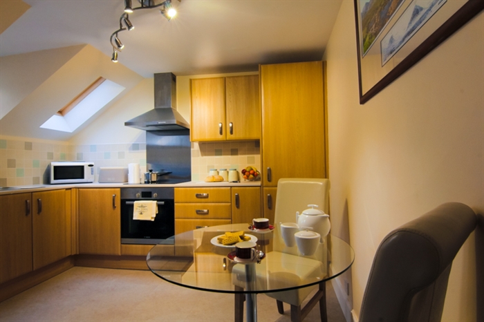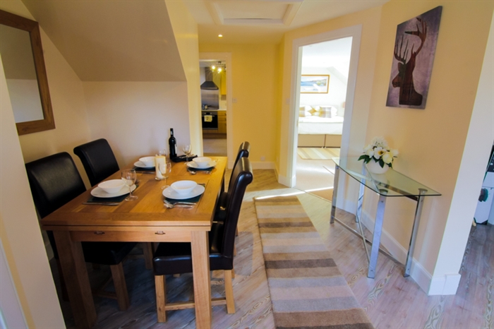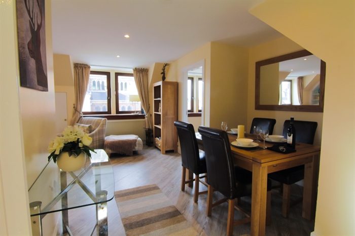 The open plan lounge diner affords stunning views of the River Ness and the famous three graces statue. Solid Oak dining table and genuine leather roll back dining chairs guarantee your comfort at mealtimes prepared in your luxury fully fitted kitchen, boasting the latest induction hob technology, electric oven, microwave , fitted fridge freezer and dishwasher. The fully equiped kitchen also contains a small breakfast table and chairs.