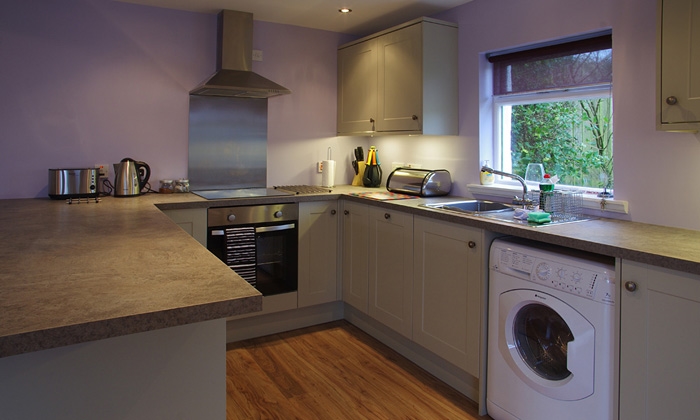 The kitchen-diner is situated at the far end of the lounge area and is fully equipped with ceramic hob and oven, microwave, fridge freezer, dish washer, washer/drier and loads of cupboard space full of quality crockery and utensils.