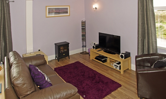 The spacious open plan lounge has been well planned and equipped, creating the perfect sociable space in which to lounge and relax. The furnishings and fittings are of a high standard throughout, and are complemented with little touches of island culture. Large lounge windows allow sunlight to stream in on sunny days, and the wood-burner effect electric stove creates a cosy hideaway whatever the season.