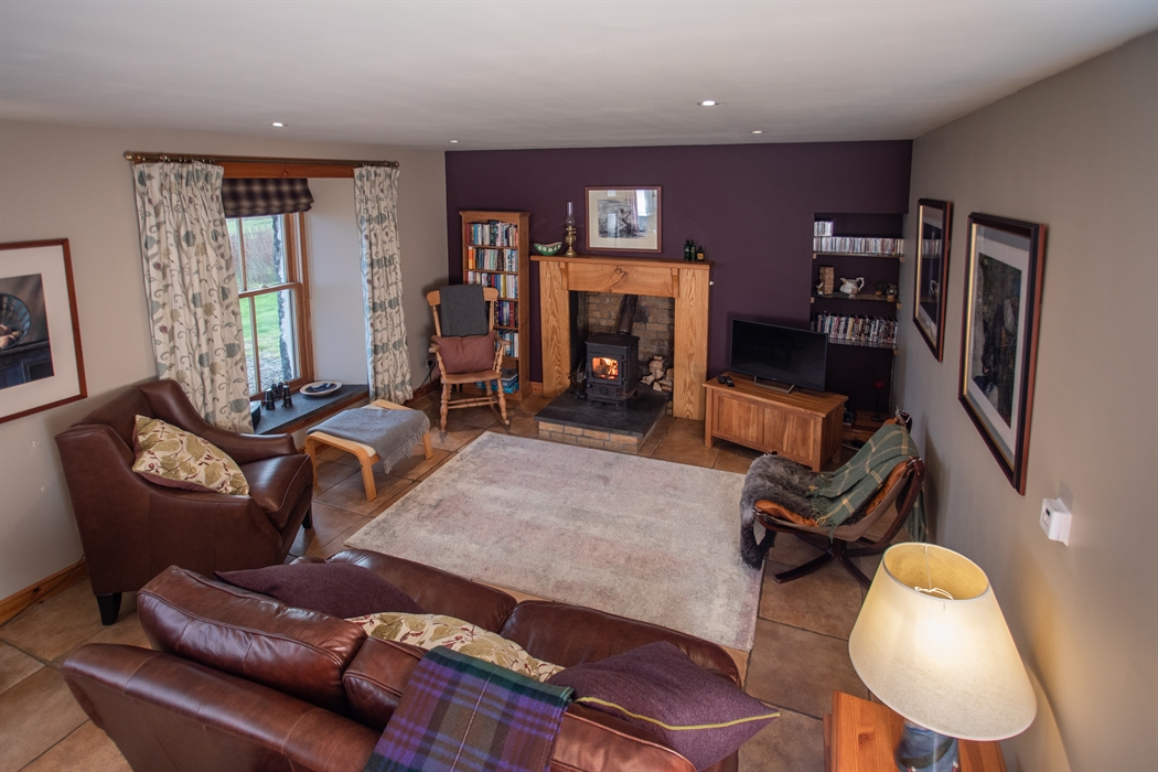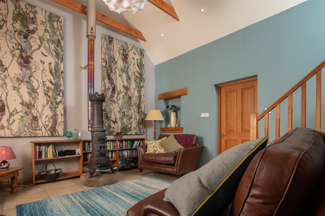 The Byre also has 2 bedrooms that can be arranged as either super king beds or twins. One bedroom is on the ground floor with an ensuite. The Byre has a large double-height living area with wood burner and a spacious, sociable kitchen. There is a family bathroom and large bootroom too with laundry facilities.