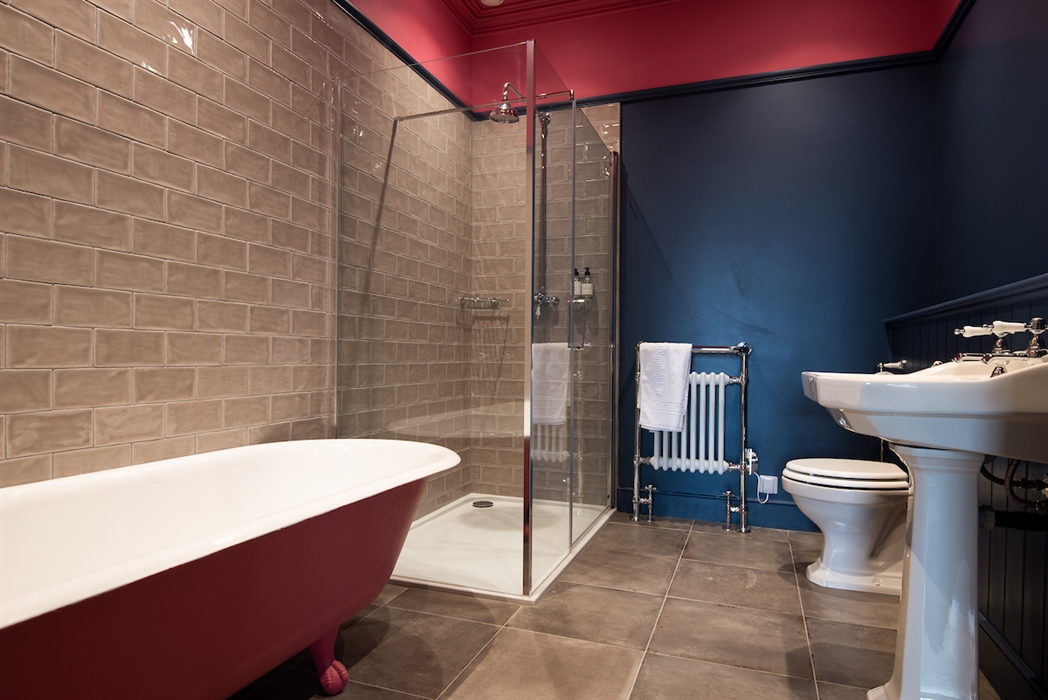 En suite bathroom with roll-top bath, separate walk-in shower, heated towel rail, basin and WC.
