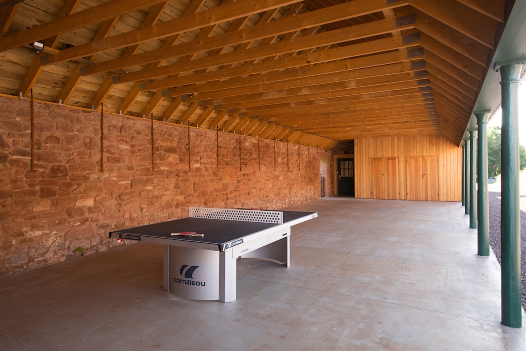 To the rear of the Steading is a paddock which is ideal for outdoor activities such as football, rounders, picnics or yoga. There is a fire pit and log stool seating area to one side beneath the ruins of Papple Convent. The cart shed has a table tennis table and table football will be available from early October.