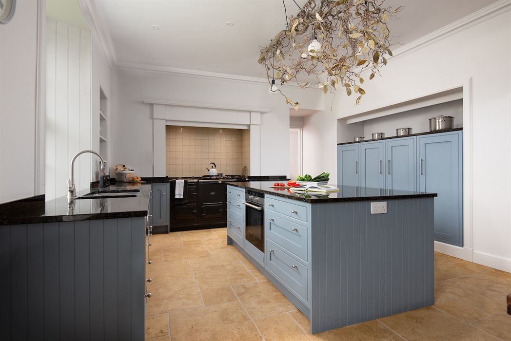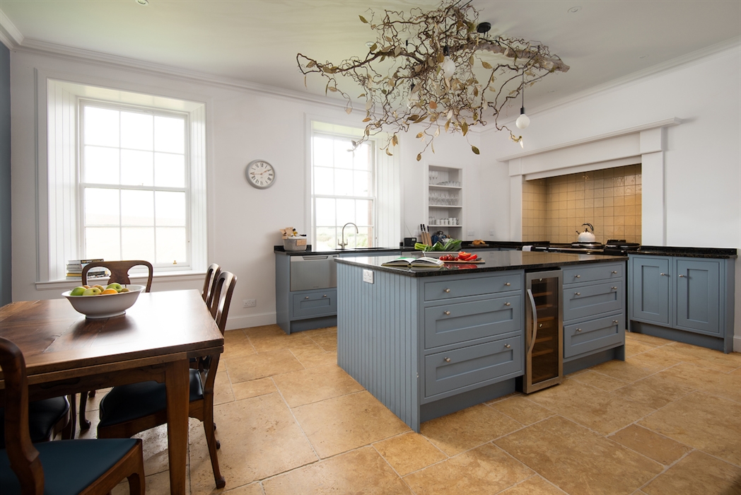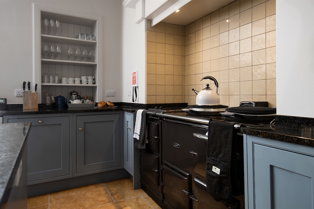 Hand-crafted oak kitchen with breakfast dining area for six guests, five-oven electric Aga with two hotplates and warming plate, electric oven, large fridge, large freezer, drinks fridge and two single-drawer dishwashers.