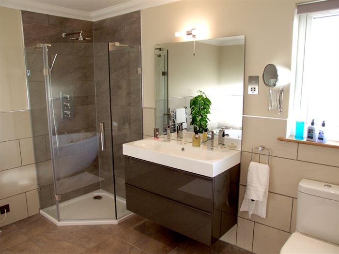The large modern bathroom, including the oval freestanding bath and underfloor heating, ensures you have all the facilities you need to refresh and pamper yourself.