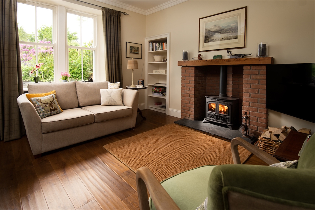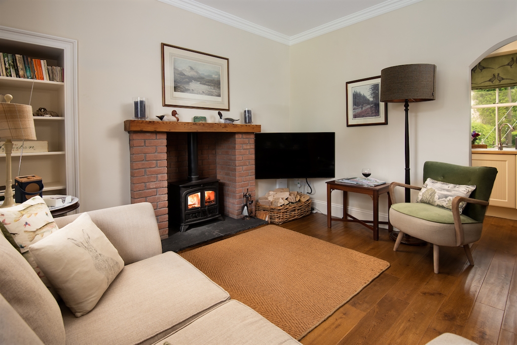 Sitting room with double sofa, armchair, 50” Smart TV, wood burning stove (logs supplied). Dining space with seating for three. Selection of books and games, DAB radio.