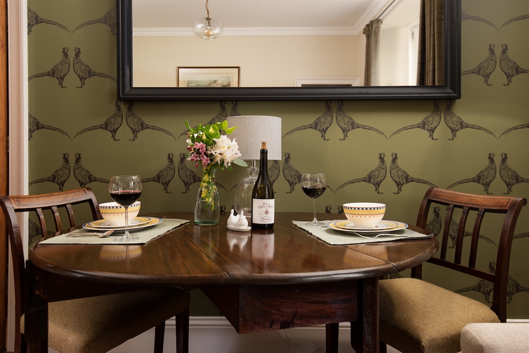 With super-fast fibre broadband (up to 70MB) available, it’s easy to stream films each evening during lazy nights in. Along one wall here, below pheasant-themed print wallpaper, beckons a dining table for two.