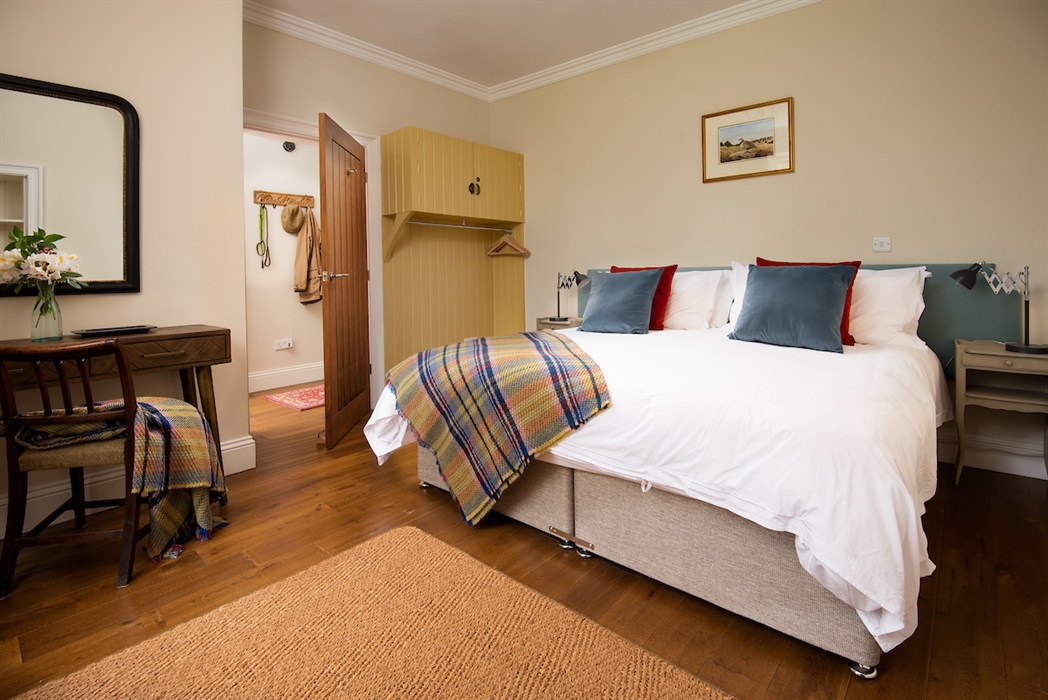 Bedroom with zip and link bed which can be configured to a 6’ super king or 3’ twin beds, side tables, hanging rail, desk/console, cupboard with shelving and storage space.