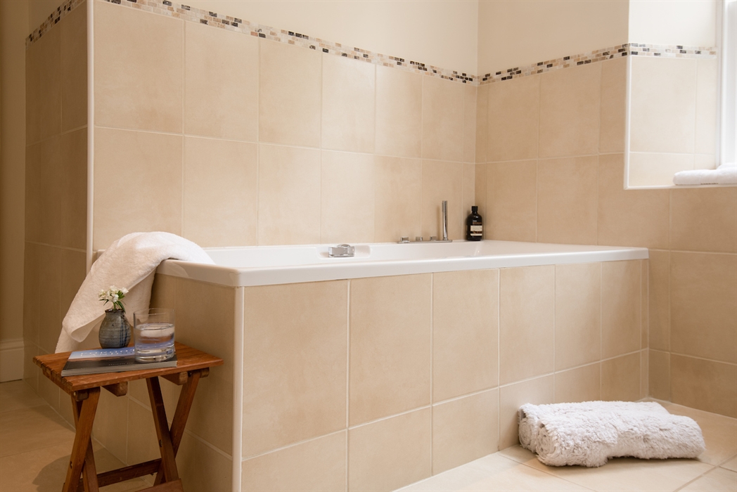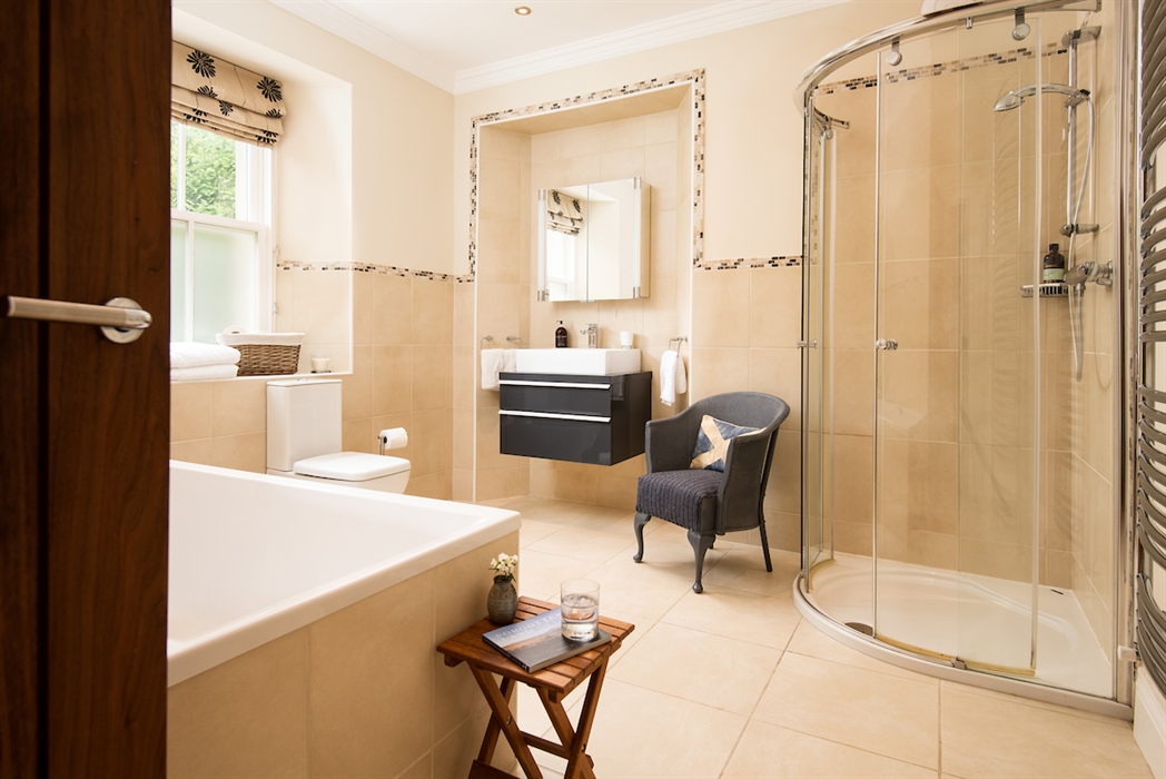 Large bathroom with large bath, corner shower, heated towel rail, basin and WC. Underfloor heating.