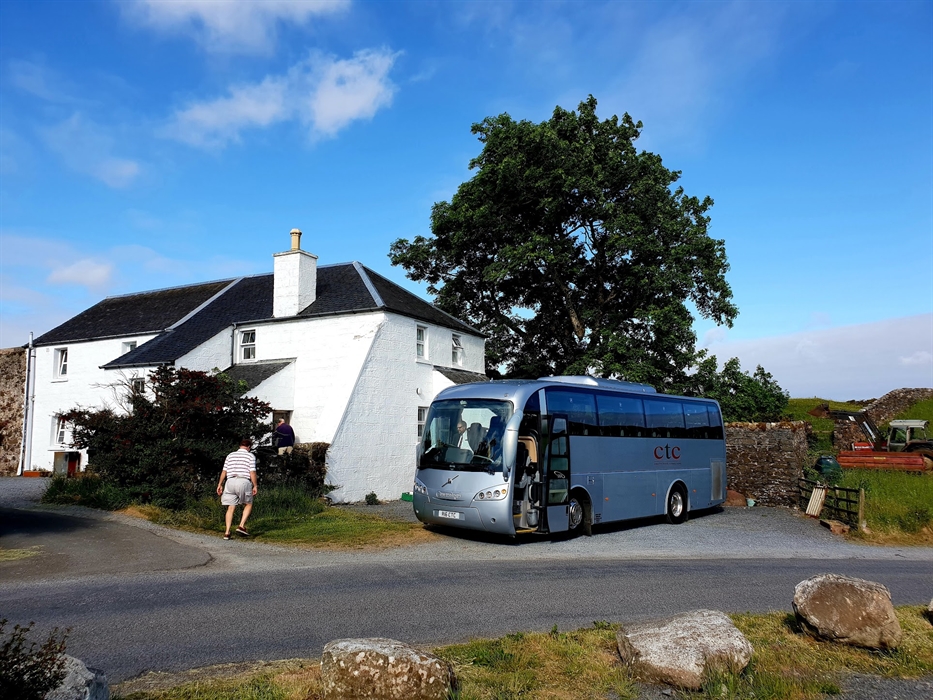 There is a bus service operating on the island run by mundells coaches from Monday to Saturday. Keills bus stop is a ten minute walk from Persabus Farm.