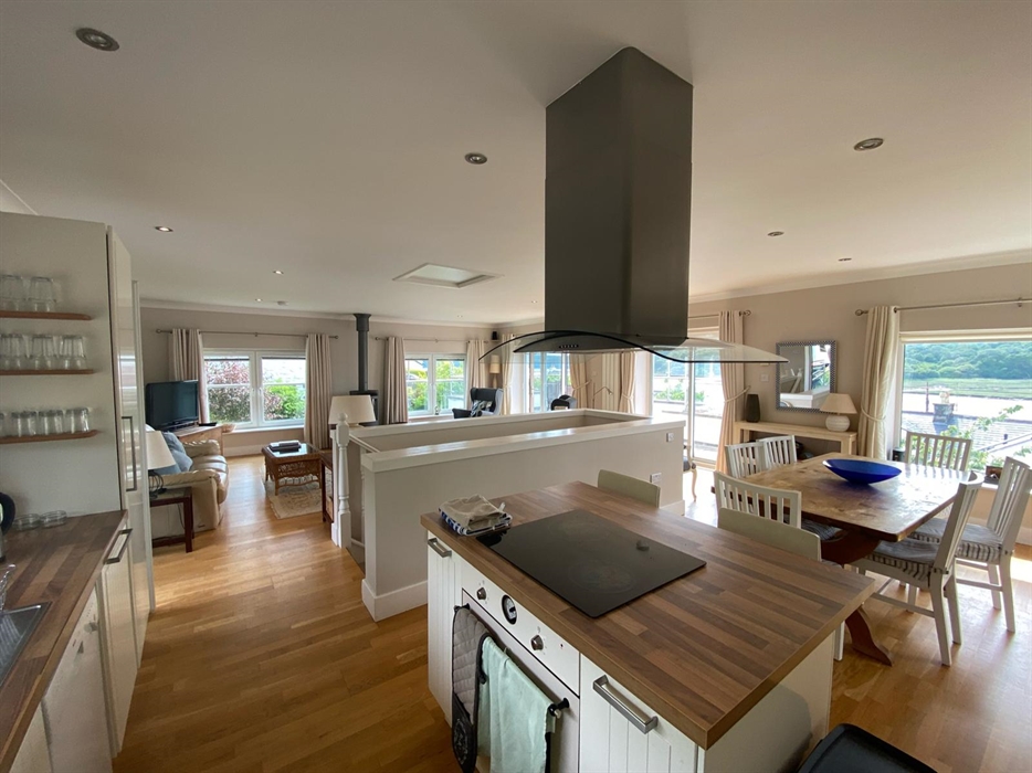 First floor: Open plan living area with separate areas for sitting, dining and fully fitted kitchen; wood burning stove, patio door to balcony