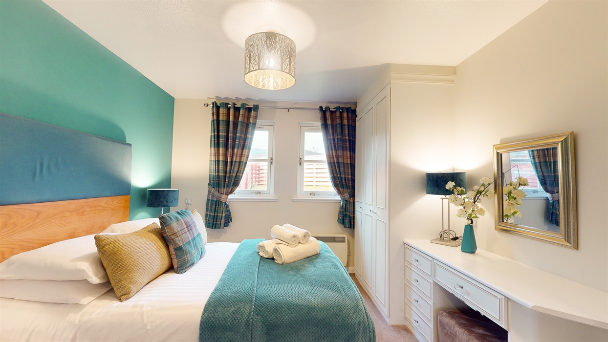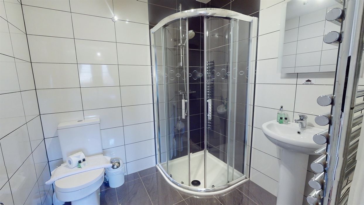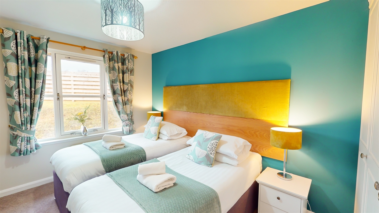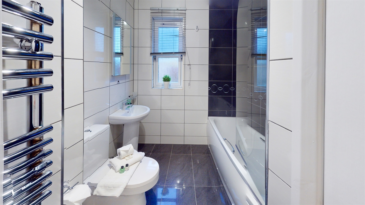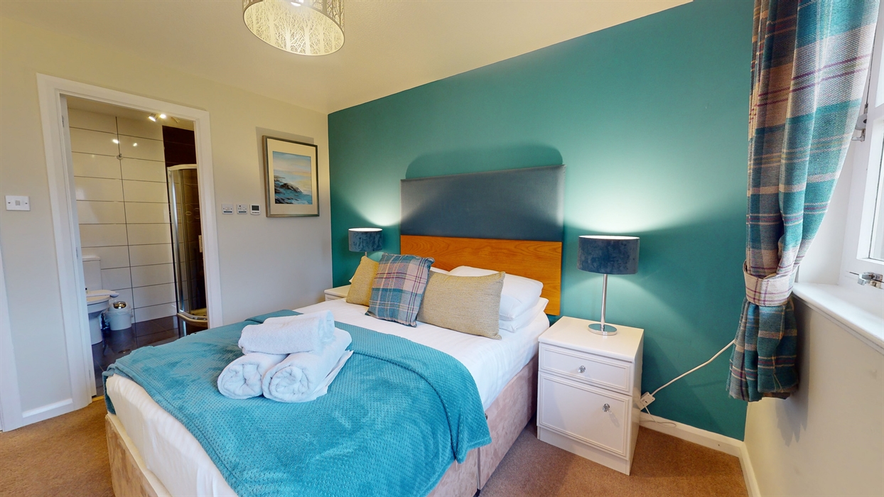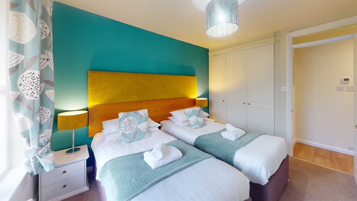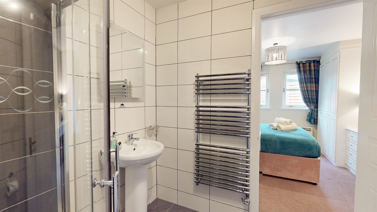 The family bathroom, located next to the twin bedroom, features a shower over the bath and is equipped with electric towel rails and underfloor heating, ensuring a luxurious experience for guests.