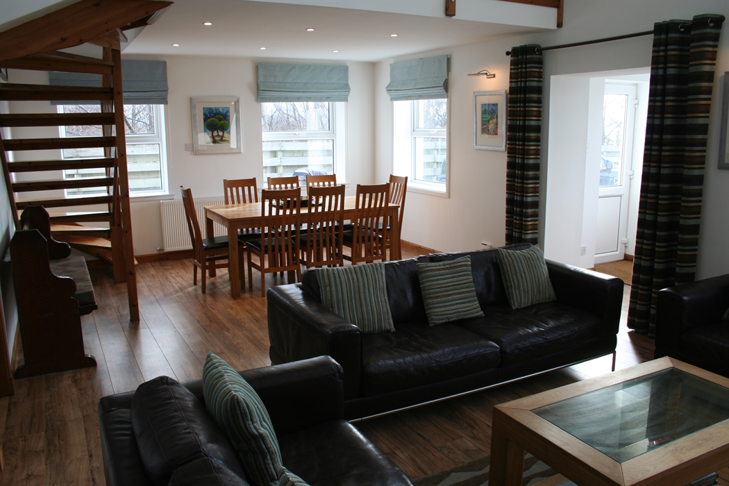 The double height spacious living area has three sofas around the wood burning stove. There is Wi-fi, internet TV, a DVD player and radio/IPOD player. The dining area has a table which seats 8 and the gallery above the dining area also has a TV, DVD player and large L-shaped sofa/sofabed.
