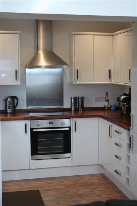 The contemporary kitchen off the livingroom is well equipped, with electric oven and induction hob, fridge, freezer, washing machine and dish washer. There is also a microwave, toaster, kettle and espresso machine.