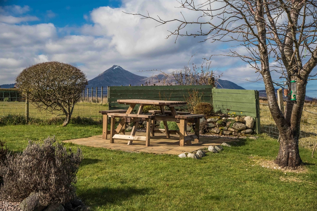 Situated conveniently a mile from Brodick in a quiet rural location, with beautiful views of the sea in one direction and Goat Fell mountain in the other. Superbly furnished and equipped, including Wi-Fi/fibre broadband, 50inch Smart TV with Sky and Netflix, DVD player with over 40 DVDs and box sets, a jacuzzi and double wood burning stove.