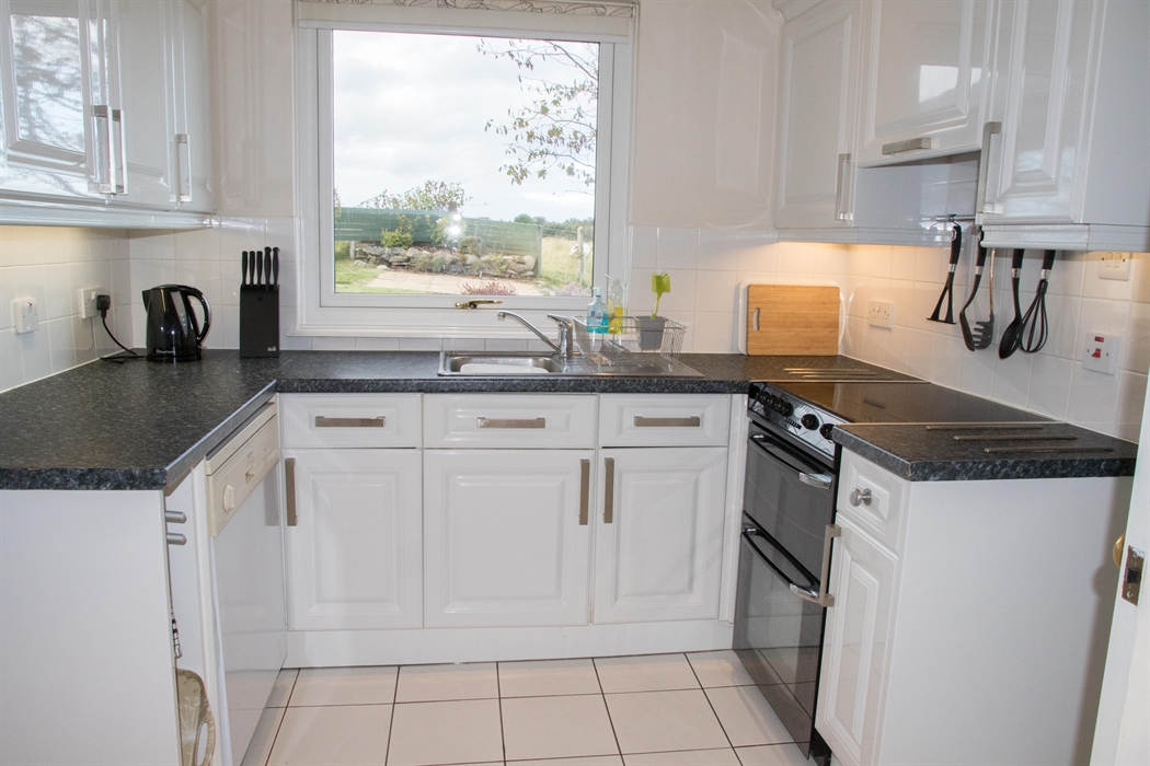 * The kitchen, which overlooks Goat Fell mountain, is modern and fully equipped, including a fridge, electric hob and double oven, microwave, toaster, electric kettle and dishwasher. There are two steps up to a separate utility room containing a washing machine, tumble drier and fridge/freezer.
