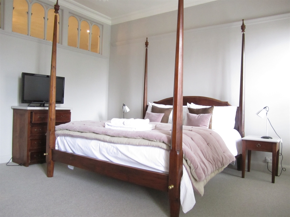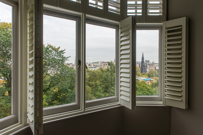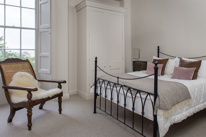 Next along is the first of the apartment’s double bedrooms, with a window looking out to the New Town and Fife beyond. This room contains a King-size bed, fitted double wardrobe and wooden armchair. The neighbouring master bedroom is similar in style, but features a Super-King-size four-poster bed, flatscreen TV with integrated DVD player atop a chest of drawers, double wardrobe, double cabinet, and teardrop chandelier.