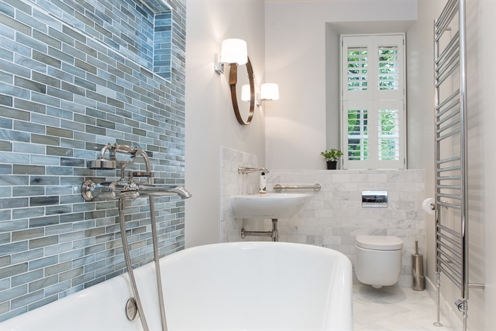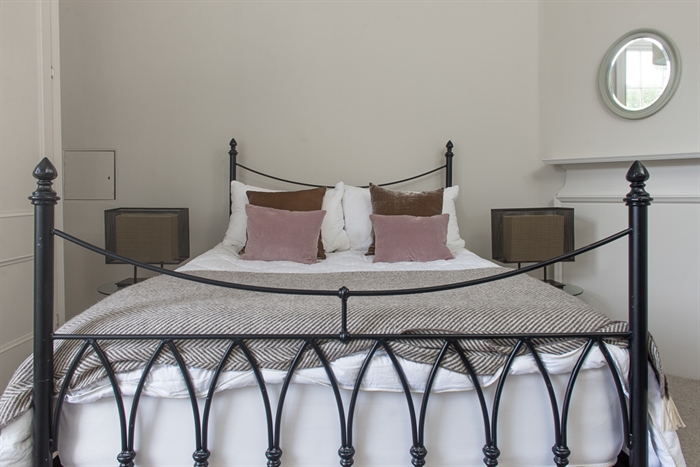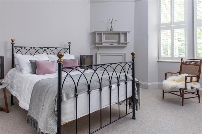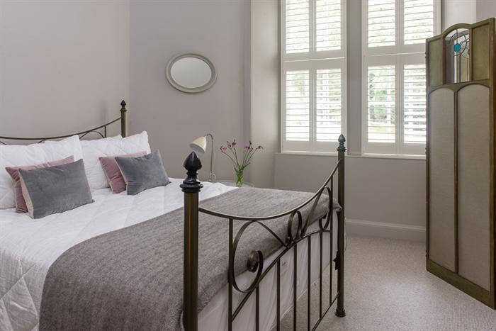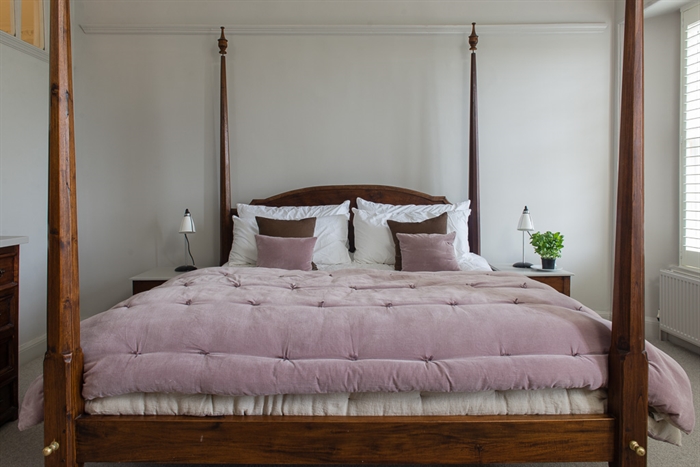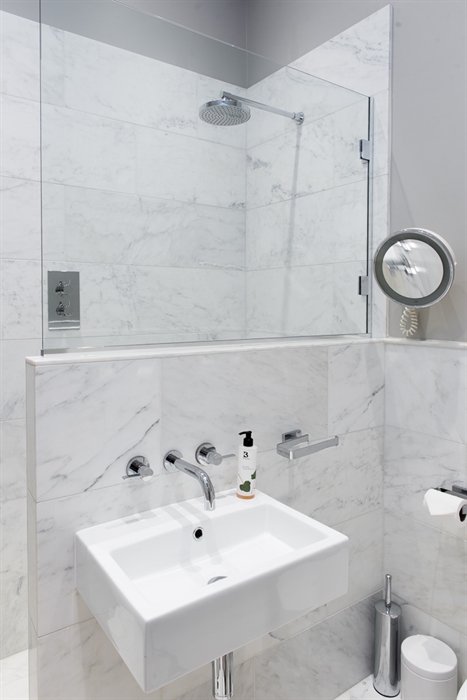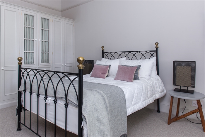 Directly off the left of the main hall is a further double bedroom with a King-size bed, an armchair, and double wardrobes on either side of a curtained cabinet. In the rightmost of these, you’ll find the apartment’s boiler; the heating is controlled via a panel in the lobby branching off the back of the main hall. This lobby also contains a utility closet with iron and ironing board, and the bathroom, which has a freestanding roll top bath with decorative claw feet and an attached shower head. Both the bathroom and the nearby shower room with wet area have heated towel rails and electric underfloor heating, affording an additional source of homely comfort on chilly days. The fourth of the apartment’s double bedrooms (again with a King-size bed) is to be found beside the shower room, and houses a dressing screen and integrated triple wardrobe.