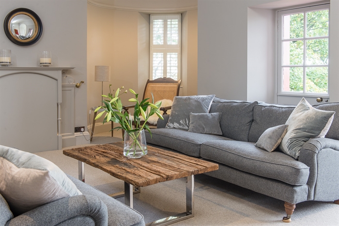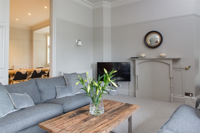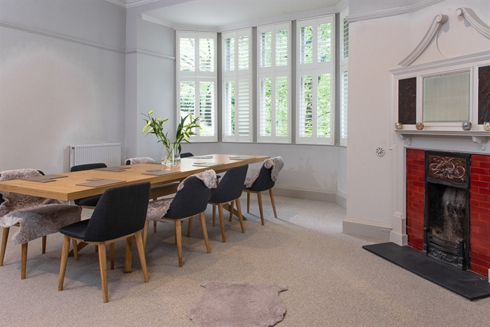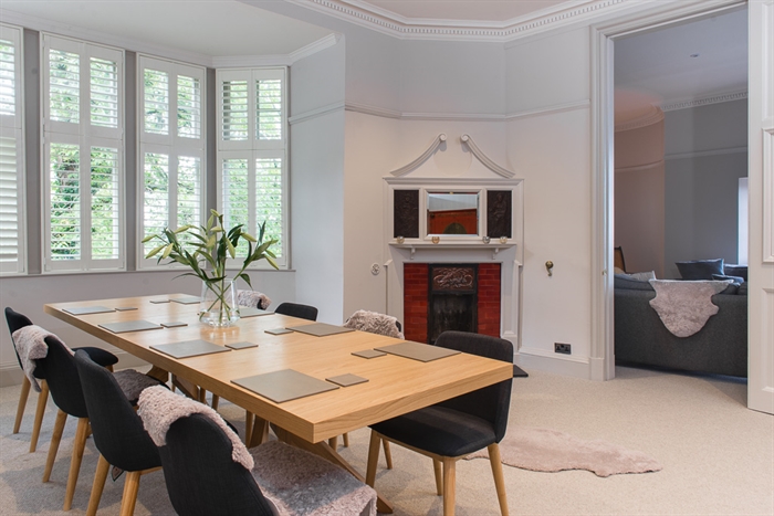 Off the farthermost left end of the hall is the living room, which has bay windows looking out to the bustling Princes Street and North Bridge. Here the profusion of the garden’s greenery is apparent, conveying the complementary sense of country living underlined by the rustic coffee table between the room’s two sofas, and so the apartment combines the best of both worlds. On opposing sides of the room are an antique Chinese double cabinet and a wall-mounted 4K Ultra HD Smart TV with Sonos speaker system, itself adjacent to the room’s wooden armchair, although the TV’s hinge allows for optimal viewing regardless of position. A small balcony adjoins the living room, offering clearer views of the garden and New Town. On the opposite side are folding doors leading on to the dining room, which also has bay windows and a matching Chinese double cabinet, as well as a dining table seating eight and an engraved oriental fireplace.