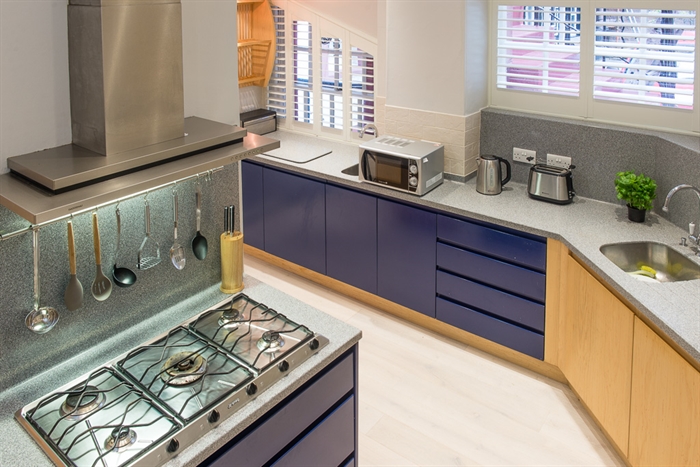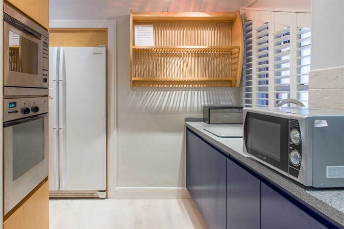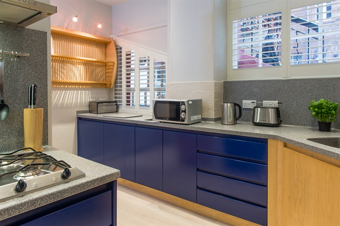 The final room of the apartment is its kitchen, which has the facilities for two to cook simultaneously in its ample worktop, dual elevated ovens, gas cooking range and twin sinks. There is an equal abundance of storage space, with the central unit sporting drawers on three sides, and cupboards running from the door along to the Samsung fridge-freezer. The kitchen also contains a dishwasher and washing machine.