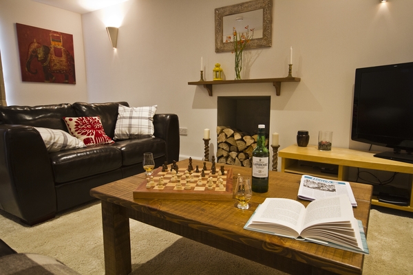 LOUNGE Double doors from the dining area lead to the cosy lounge with wood burning stove, large leather sofas, HD TV and small writing desk and chair. TVs have freeview channels and there is free WiFi for guests.