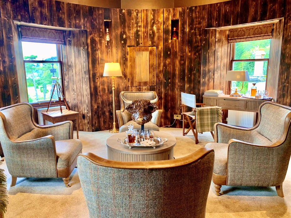 As you climb the winding staircase to the very top of the Rothes Glen tower, you reach the new whisky observatory. Wood panelled to mimic the inside of a whisky washback, you can sit and enjoy the stunning views with a dram and telescope or read next to the fire in one of the tweed armchairs