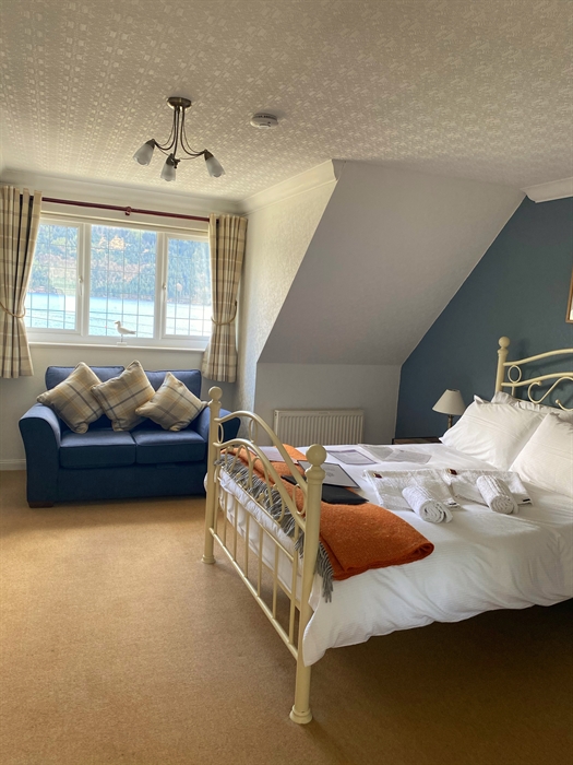 The self-catering apartment has stunning loch views from both the ground and first floor. Guests in the self-catering apartment can arrange to have breakfast at an additional charge. The self-catering apartment has a full-sized oven / grill, four-ring hob and a separate microwave oven,and also has a smart TV with Sky Q access.